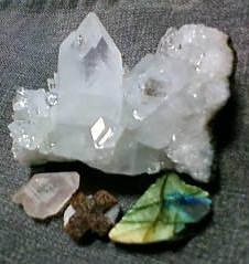 後ろの大きな塊は、水晶に似ていますが「魚眼石」という別物です。